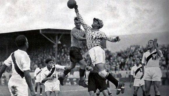 El arequipeño Jorge Pardón, arquero de la Selección de fútbol de Perú, en el 1er Mundial de Fútbol 1930, celebrado en Uruguay. Inaugurando el estadio Centenario en Montevideo.